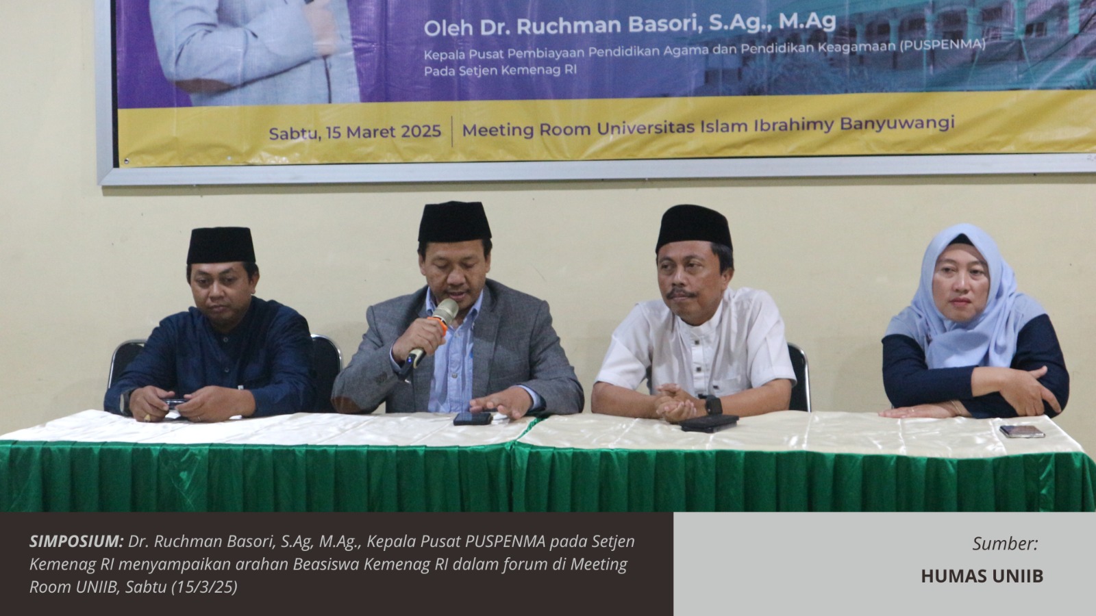 GENTENG – Universitas Islam Ibrahimy Banyuwangi (UNIIB) menyelenggarakan kegiatan sosialisasi beasiswa Kementerian Agama Republik Indonesia (Kemenag RI) bertempat di Meeting Room kampus pada sabtu, 15 Maret 2025. Acara ini dihadiri oleh Dr. Ruchman Basori, S.Ag., M.Ag., Kepala Pusat Pembiayaan Pendidikan Agama dan Pendidikan Keagamaan (PUSPENMA) pada Setjen Kemenag RI. Kegiatan ini bertujuan untuk menyampaikan informasi terbaru terkait program beasiswa yang tersedia bagi mahasiswa guna meningkatkan akses pendidikan tinggi dan mengembangkan kualitas sumber daya manusia (SDM) di lingkungan perguruan tinggi Islam.