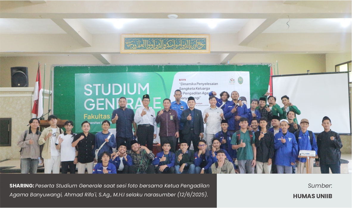 BANYUWANGI – Fakultas Syariah Universitas Islam Ibrahimy (UNIIB) Banyuwangi menggelar Studium Generale di Auditorium KHR. As’ad Syamsul Arifin pada Rabu pagi (12/6/2025). Kegiatan ini diikuti oleh seluruh mahasiswa Fakultas Syariah, khususnya mahasiswa semester enam yang akan melaksanakan Praktik Pengalaman Lapangan (PPL) II.