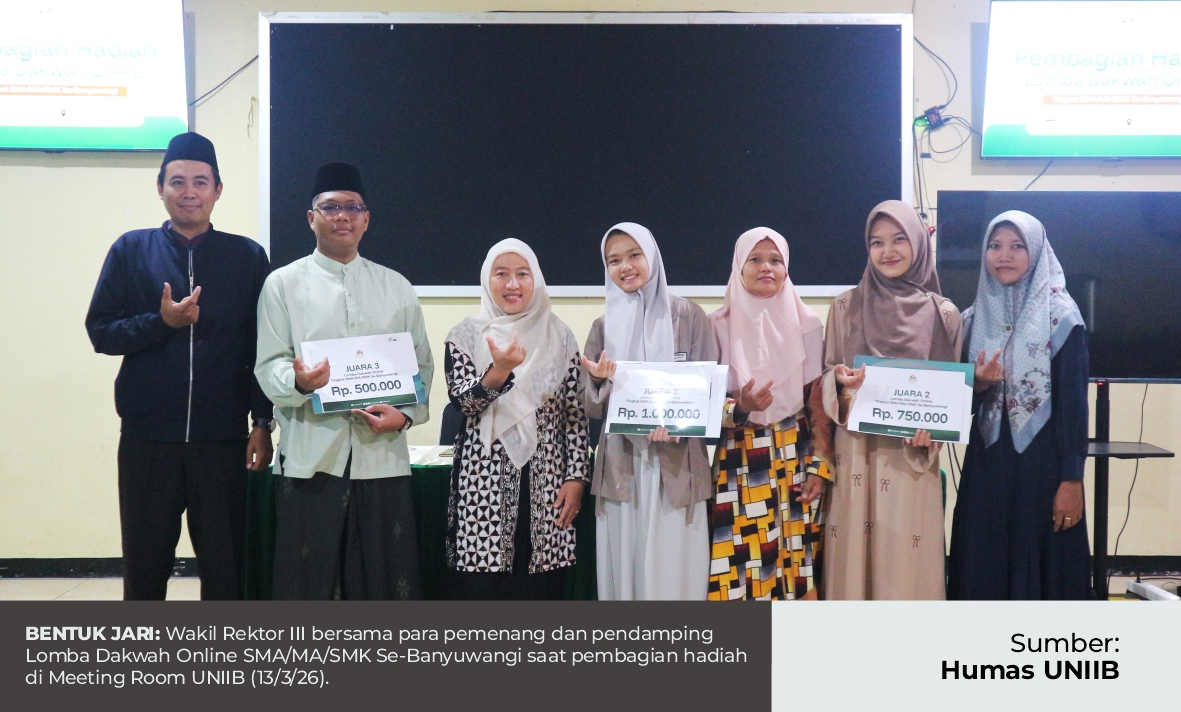 BANYUWANGI – Setelah berlangsung kurang dari dua minggu masa pendaftaran sekaligus penilaian, Lomba Dakwah Online Tingkat SMA/MA/SMK Se-Banyuwangi akhirnya memasuki penghujung giatnya, yakni pembagian hadiah kepada para juara. Pembagian hadiah yang dilaksanakan pada Jumat siang (13/3/26) di Meeting Room Universitas Islam Ibrahimy Banyuwangi ini dihadiri oleh para pemenang, orang tua dan guru, serta hadir pula dari pimpinan UNIIB, yakni Wakil Rektor III, Dr. Kurniyatul Faizah, M.Pd.